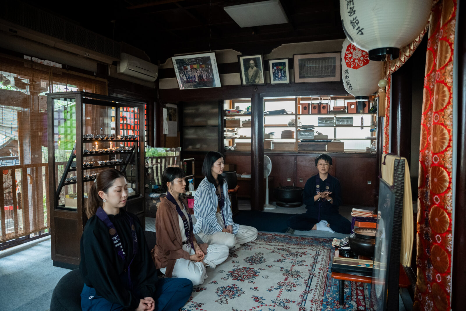 お寺の本堂で作務衣に着替えて輪袈裟を身につけ、一心寺副住職による座禅体験や仏具磨きなど、心を静め、自分と向き合う特別な時間をお過ごしいただけます。