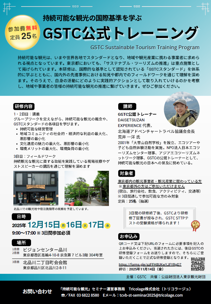 2025年12⽉17⽇(水)に行われたGSTC公式トレーニングにて、弊社代表 渡邊崇志と「宿場トラベル」チームが、ゲストスピーカーおよび進行を務めました。